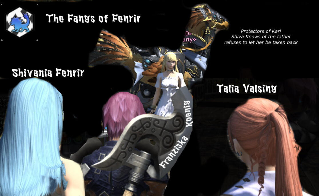 Nazahr - Her first crush and now husband. Kari and Naz already are having a child now as of the medical aid she got on their honeymoon from their friend, and they ran into two teens who are their children from another shard.Arya Leforeux - Kari and Naz's daughter from another shard. She came to help protect her parents along with the family friends from her grandfather King.Conrad Leforeux - Kari and Naz's son and younger brother to Arya from another shard. Conrad is very close to his mother and often is talking about tech and keeping distant from the fights.Rhetori Cole - Kari's former boss at the Tavern, she has become like a mother to Kari and always is watching over the girl and taking care of her.Toya - An au ra who had a similar family like Kari. She is an older woman who often is hanging with others in lantern or working with Kari to improve not just the workers but also the lives of those she is around. Toya has recently moved in with Nazahr and Kari to aid in helping the family medically and watching over them.Alice - The cafe manager at the Azure Flames who often was checking on Kari. She became a friend who is around often and keeping track of the girl.Typriss - A friend of Alice's and to Kari. She was met through Lizzy.Bella Dakwhil - Kari has been starting to teach the girl and take her under her wing as a cook and seamstress.Lizzy Mercer - A blue mage, a drunk, and a greedy woman who surprisingly has a good heart. She comes and goes but is someone who will sacrifice herself for those she considers friends.The Fangs of Fenrir - A mercenary group that met Kari on her travels from a mision. They aided her on several occasions now and keep an eye on her. One realized who she was from the family crest and gave her a shell to keep in contact.Shivania Fenrir - Leader of the Fangs of Fenrir, she took a liking to Kari and has been protective of the girl. She knew of her father and refuses to let him get his hands on her.Talia Valsing - One of the Fangs members always around Kari and with her boss Shivania. This redhead is a bit of a spitfire once she warms up.Franziska Koenig - A more wise member in the fangs. She is the third of the three amigos around Kari during most of her time with Shivania. Franziska has some words but is very few and important when spoken.Claire Leyden - One of Nazahr's friends. She seems to have a protective motherly side and even vouched to bring Kari on the mission before.Ophelia Moonsinger - Silent but definitely has a good heart. Not sure on why she protects but anyone risking their life to protect must be good.Luruna Vulerys - A young teen and really kind and punkish kid. She is a very strong fighter who is often wielding an axe.Wayman Blackheart - A father / Grandfather type figure. Unlike her real father, he shows emotions and seems to care. She has grown rather fond of the old man.Aldin - Kari's ex fiance who she was promised to. He seemed to at first be interested but has since vanished with his rivalry for her love being won over from her first crush.Asuna Gille